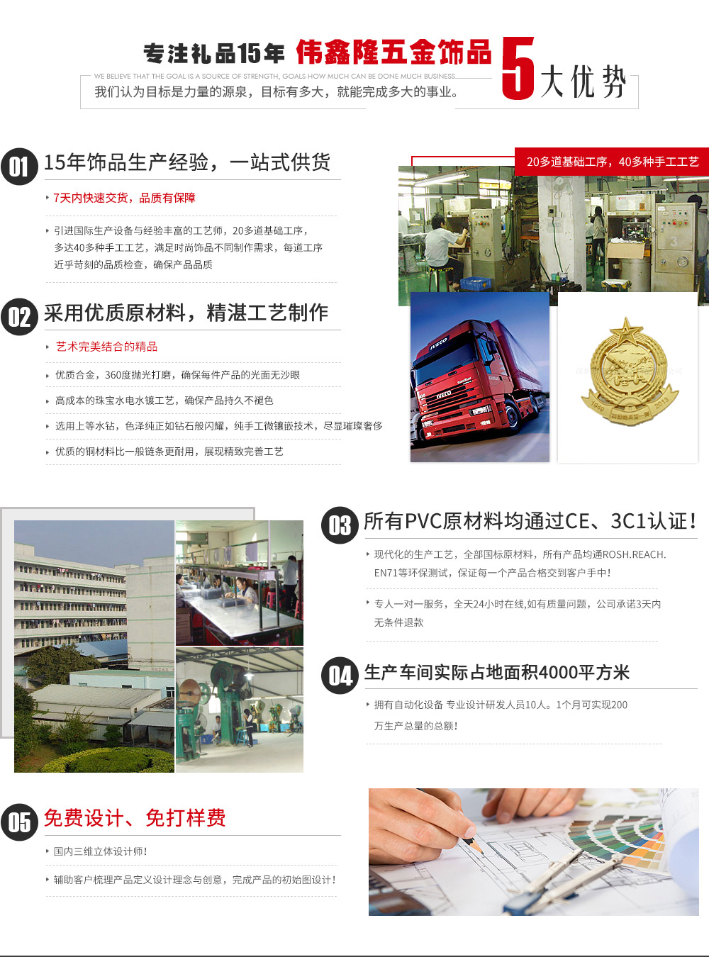 深圳市偉鑫隆五金飾品有限公司位于廣東省深圳市坑梓鎮(zhèn),是一家集設計、生產(chǎn)、銷售為一體的專業(yè)五金禮品工藝公司。 公司擁有經(jīng)驗豐富的專業(yè)技術(shù)精英團隊,至今已有十多年設計生產(chǎn)經(jīng)驗。 公司自有工廠引進先進的臺灣設備及技術(shù),擁有設計、繪圖、制模、沖壓、壓鑄、拋光、電鍍、包裝等生產(chǎn)流程,可生產(chǎn)銅、鐵、不銹鋼、鋁、鋅合金、鉛錫合金等材質(zhì)的金屬徽章、胸針、胸章、獎章、獎牌、金屬標牌、工號牌、金屬鑰匙扣、狗牌、軍牌、開瓶器、金屬手機吊飾、錢夾、領帶夾、帽夾、項鏈吊墜、掛包鉤、紀念章、紀念幣、袖扣、促銷禮品鑰匙扣、書簽、五金配件、開瓶器等旅游紀念品及工藝禮品五金飾品。我公司還可根據(jù)客戶樣板開模生產(chǎn)。 公司秉承“精...